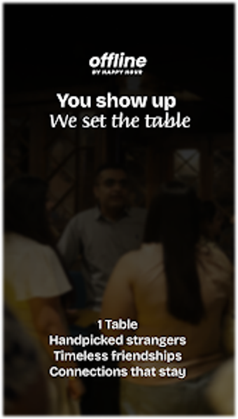 Offline โดย Happy Hour เป็นแอปพลิเคชันทางสังคมที่ไม่เหมือนใครซึ่งออกแบบมาเพื่ออำนวยความสะดวกในการเชื่อมต่อในชีวิตจริงผ่านการรวมตัวที่ใกล้ชิด แตกต่างจากแอปการสร้างเครือข่ายหรือการออกเดททั่วไป Offline เน้นการมีปฏิสัมพันธ์ที่มีความหมายมากกว่าการมีส่วนร่วมทางดิจิทัล ทำให้ผู้ใช้สามารถสัมผัสประสบการณ์การสนทนาที่แท้จริงในบรรยากาศการรับประทานอาหารที่ผ่อนคลาย แอปนี้จัดงานเลี้ยงอาหารค่ำที่มีการเชิญเท่านั้น ซึ่งแขกที่หลากหลายสามารถมารวมตัวกัน สร้างสภาพแวดล้อมที่ส่งเสริมการเปิดเผยและการเชื่อมต่อโดยไม่มีแรงกดดันจากโซเชียลมีเดียหรือความคาดหวังในการออกเดท